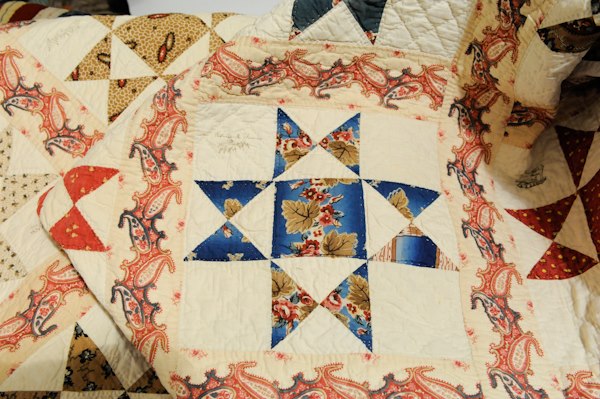 This is a wonderful antique quilt with an amazing paisley sashing and great red and greens and blues and more. The icing on the top is that it is an early signature quilt to boot.